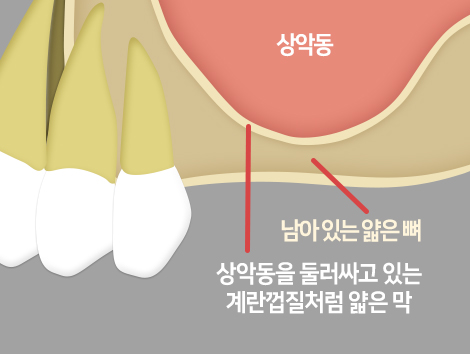 빈 공간인 상악동의 경계를 둘러싸고 있는 계란껍질처럼 얇은 막이 존재하며