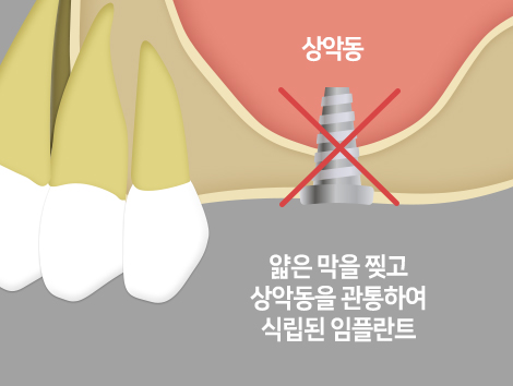 상악동의 특별한 구조 때문에 임플란트를 식립하는 일은 아래턱보다 더